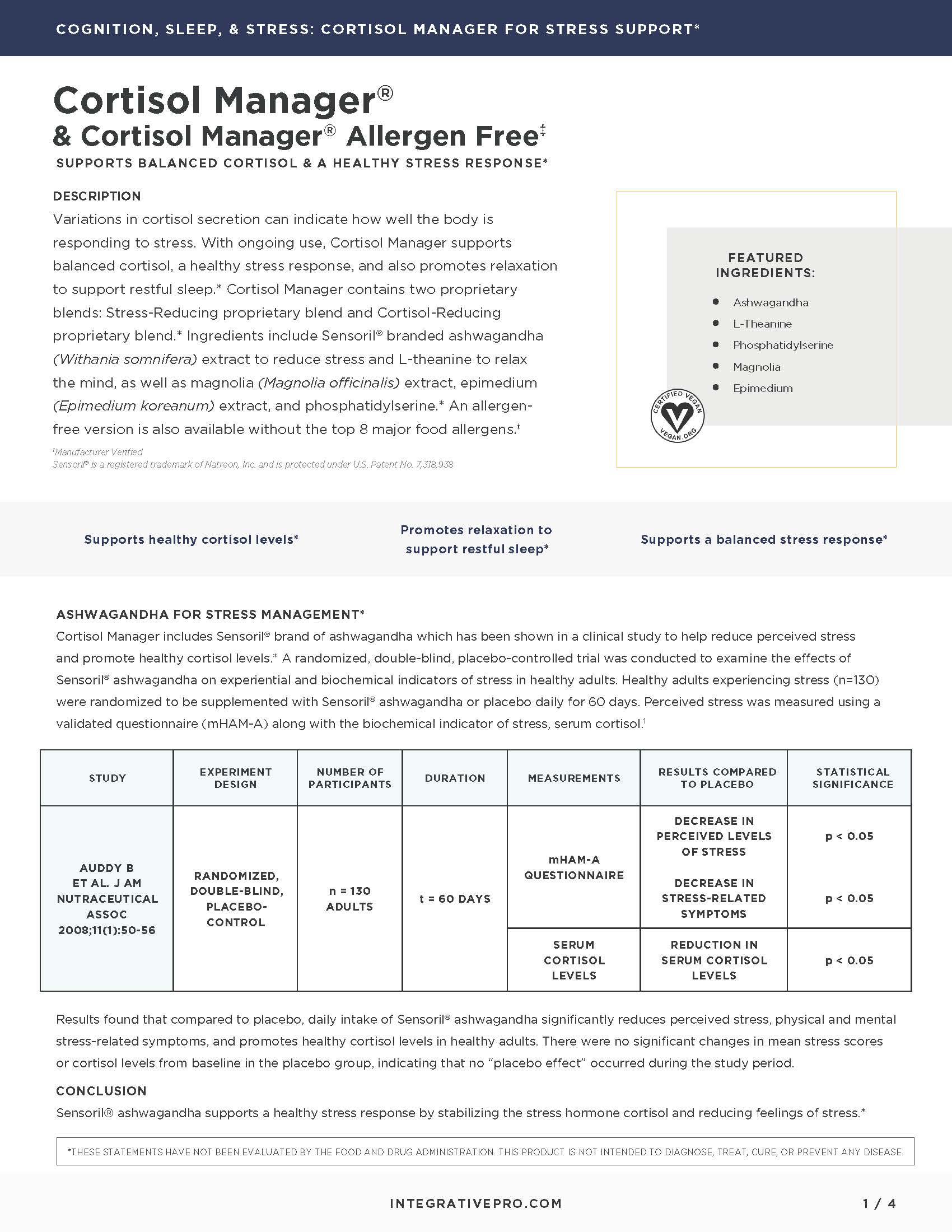 Cortisol Manager includes Sensoril® brand of ashwagandha which has been shown in a clinical study to help reduce perceived stress and promote healthy cortisol levels.* A randomized, double-blind, placebo-controlled trial was conducted to examine the effects of Sensoril® ashwagandha on experiential and biochemical indicators of stress in healthy adults. Healthy adults experiencing stress (n=130) were randomized to be supplemented with Sensoril® ashwagandha or placebo daily for 60 days. Perceived stress was measured using a validated questionnaire (mHAM-A) along with the biochemical indicator of stress, serum cortisol.