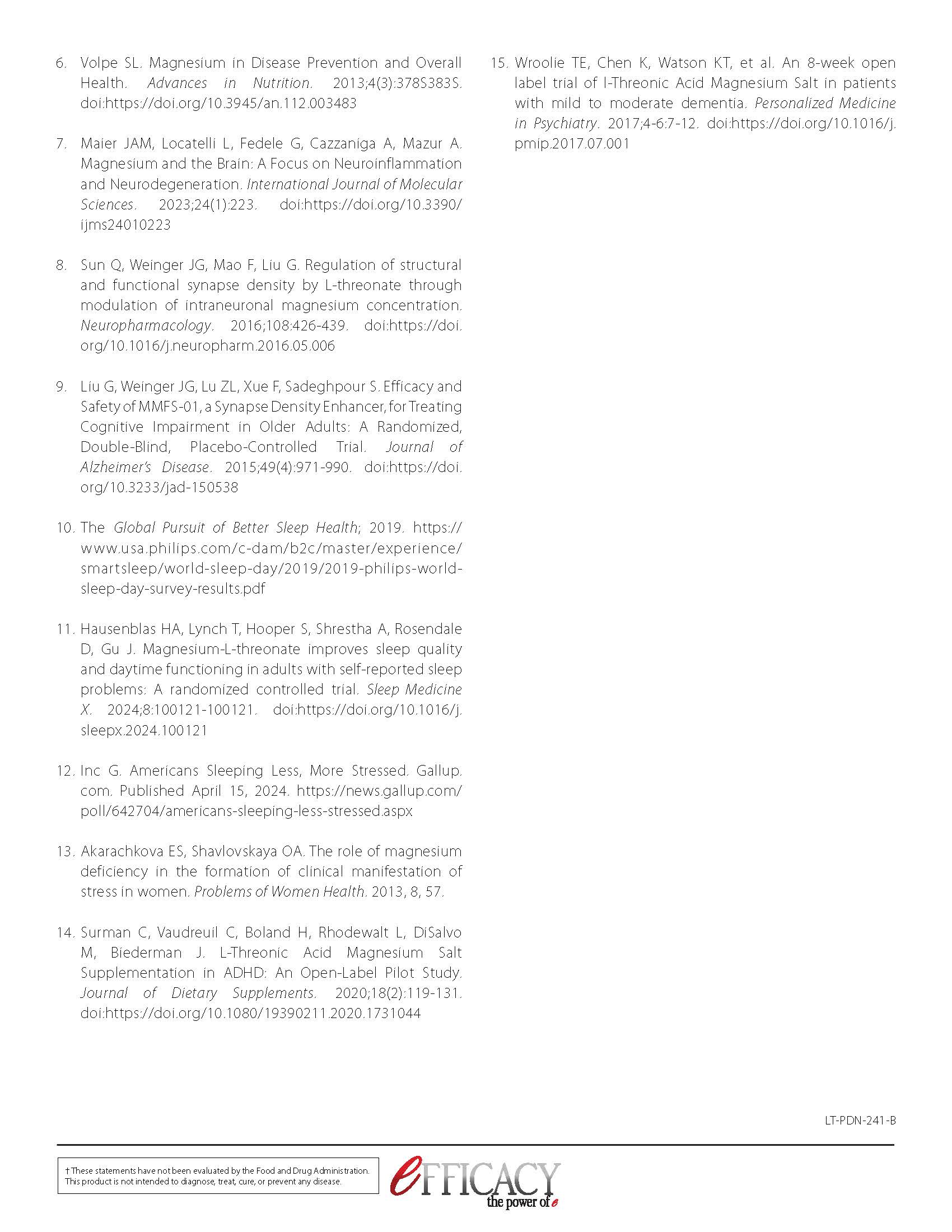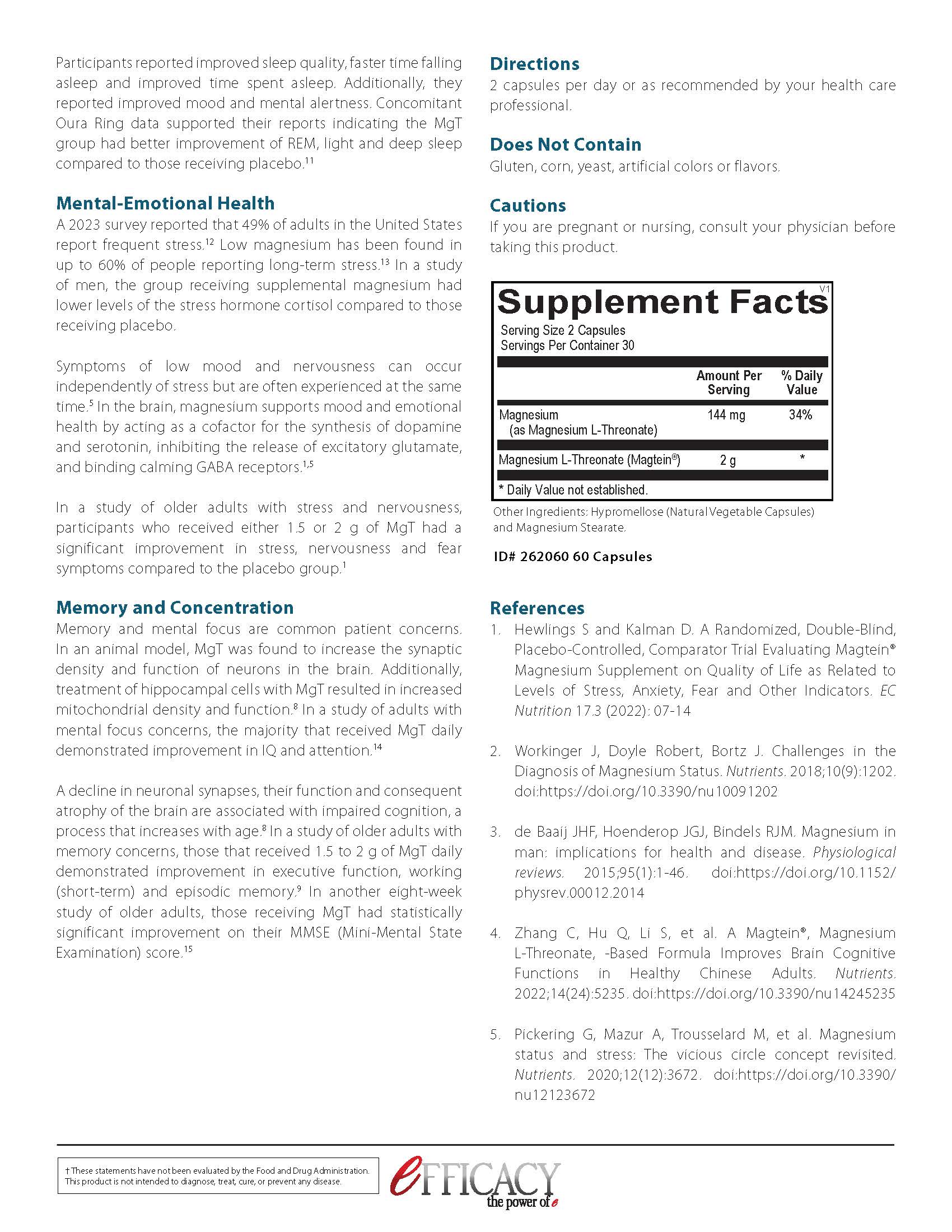 In 2010, researchers at the Massachusetts Institute of Technology published their novel discovery of magnesium L-threonate, the only magnesium complex shown to specifically increase magnesium levels within the brain. Intraneuronal magnesium has been scientifically demonstrated to support neuroplasticity and mental focus, and improve memory in the aging brain. It promotes quality of life by supporting a balanced sleep-wake cycle and mood. Mag Threonate can also help alleviate occasional nervousness and stress.