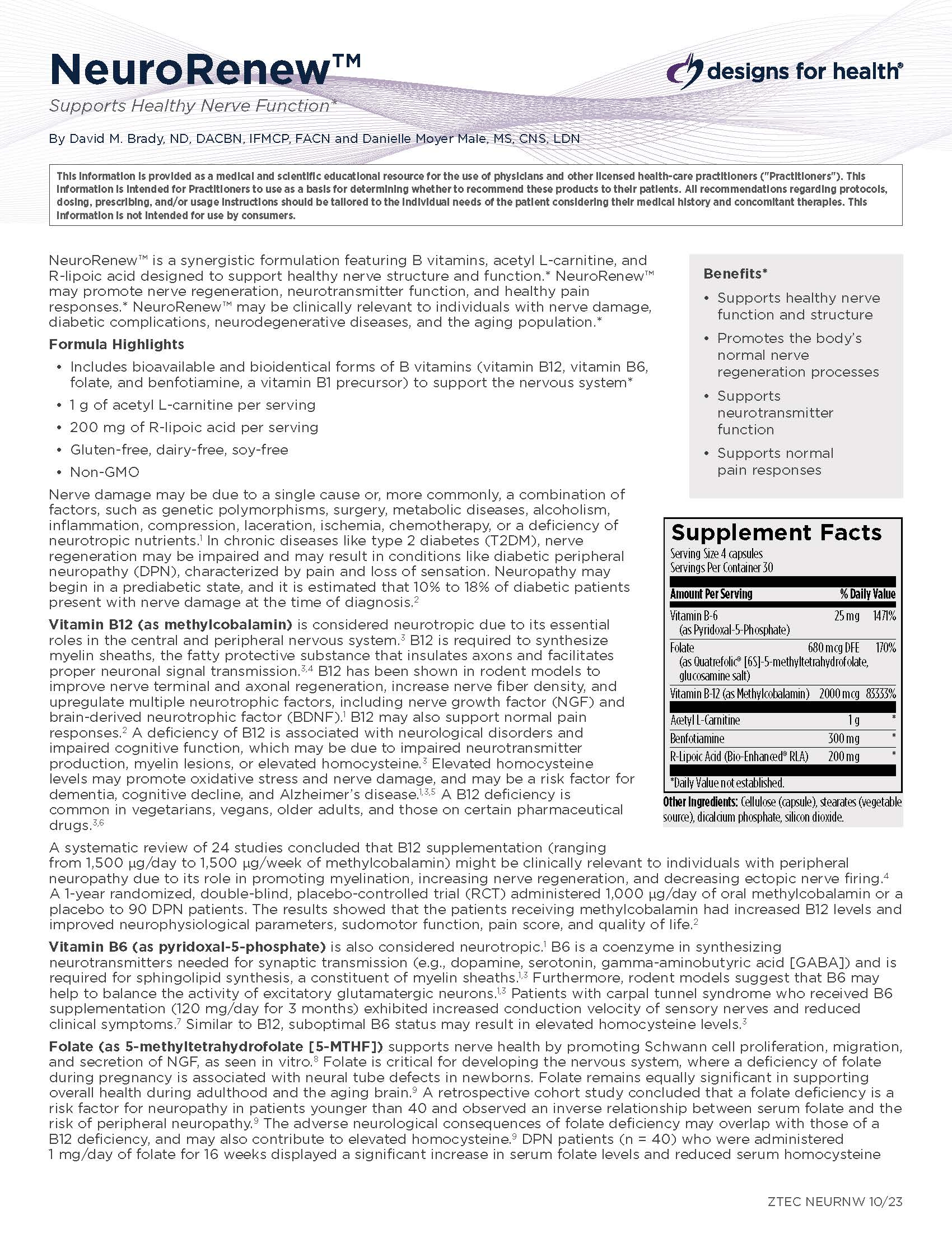 NeuroRenew™ is a synergistic formulation featuring B vitamins, acetyl L‑carnitine, and R‑lipoic acid designed to support healthy nerve structure and function.* NeuroRenew™ may promote nerve regeneration, neurotransmitter function, and healthy pain responses.* NeuroRenew™ may be clinically relevant to individuals with nerve damage, diabetic complications, neurodegenerative diseases, and the aging population.* Formula Highlights • Includes bioavailable and bioidentical forms of B vitamins (vitamin B12, vitamin B6, folate, and benfotiamine, a vitamin B1 precursor) to support the nervous system* • 1...