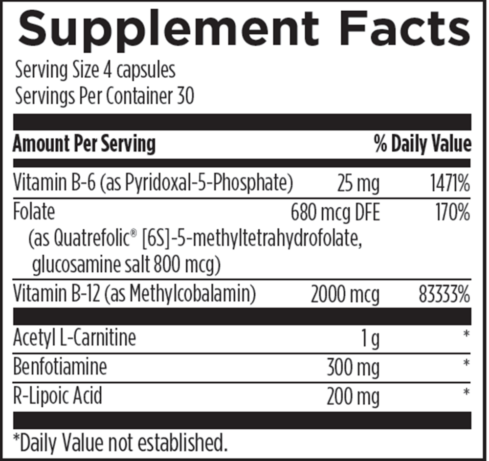 Includes bioidentical forms of B vitamins (including benfotiamine, a vitamin B1 precursor), along with R-lipoic acid and acety L-carnitine.