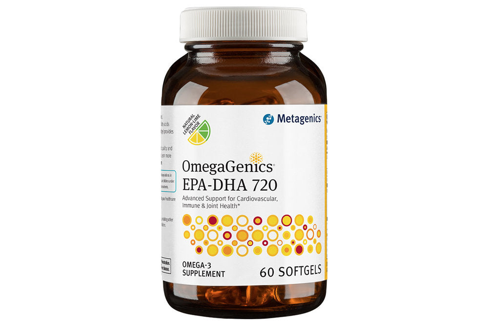 OmegaGenics™ EPA-DHA 720 is produced in Norway and features a highly concentrated source of health-promoting omega-3 essential fatty acids from cold-water fish. Each softgel provides a total of 720 mg of EPA and DHA to support healthy blood lipids cardiovas-cular health a positive mood and overall health.* This product is Gluten Free. Formulated to Exclude: Wheat gluten soy dairy products egg nuts tree nuts crustacean shellfish colors artificial flavors artificial sweeteners and preservatives.